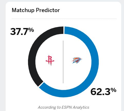 ESPN预测揭幕战:雷霆获胜概率62.3%,火箭37.7%