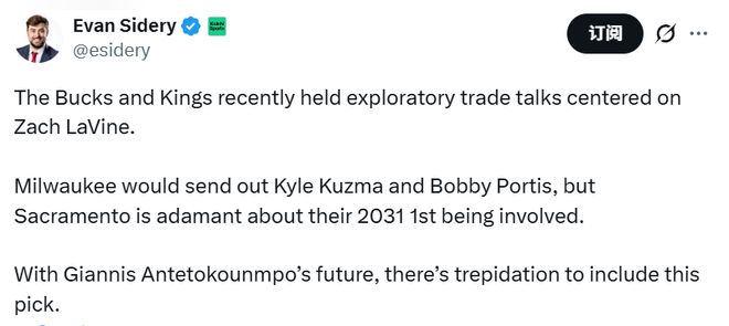 在初步提出的交易框架中,雄鹿队计划将凯尔-库兹马与博比-波蒂斯送至国王队。不过有消息称,国王队立场强硬,坚持要求雄鹿队将2031年的首轮签纳入交易筹码。考虑到字母哥的长期去向尚未明朗,雄鹿队对于送出这个选秀权一事十分犹豫。