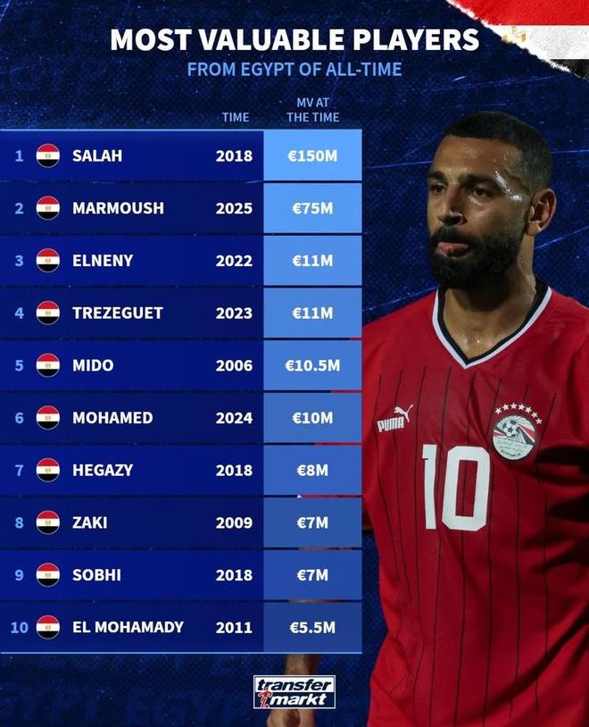 北京时间10月13日,德转统计出了埃及球员历史身价榜,2018年身价曾经达到1.5亿欧元的萨拉赫排名第一,马尔穆什7500万欧元排名第二。